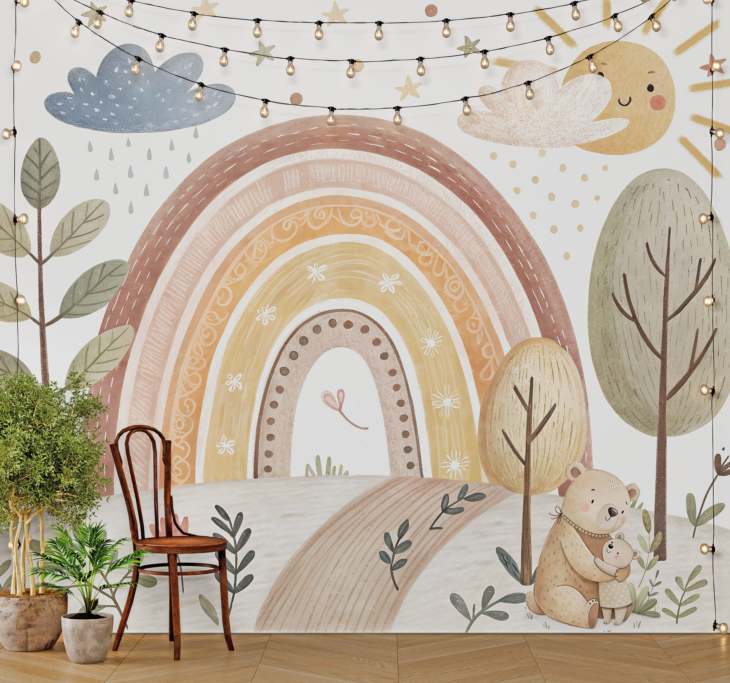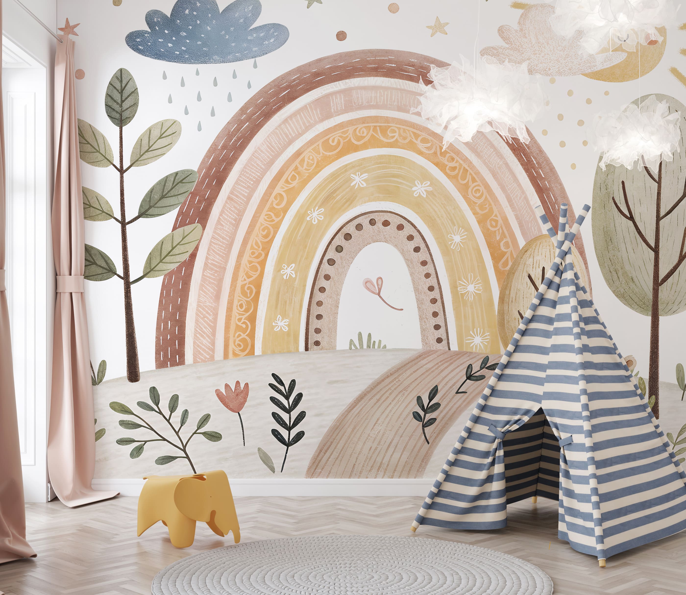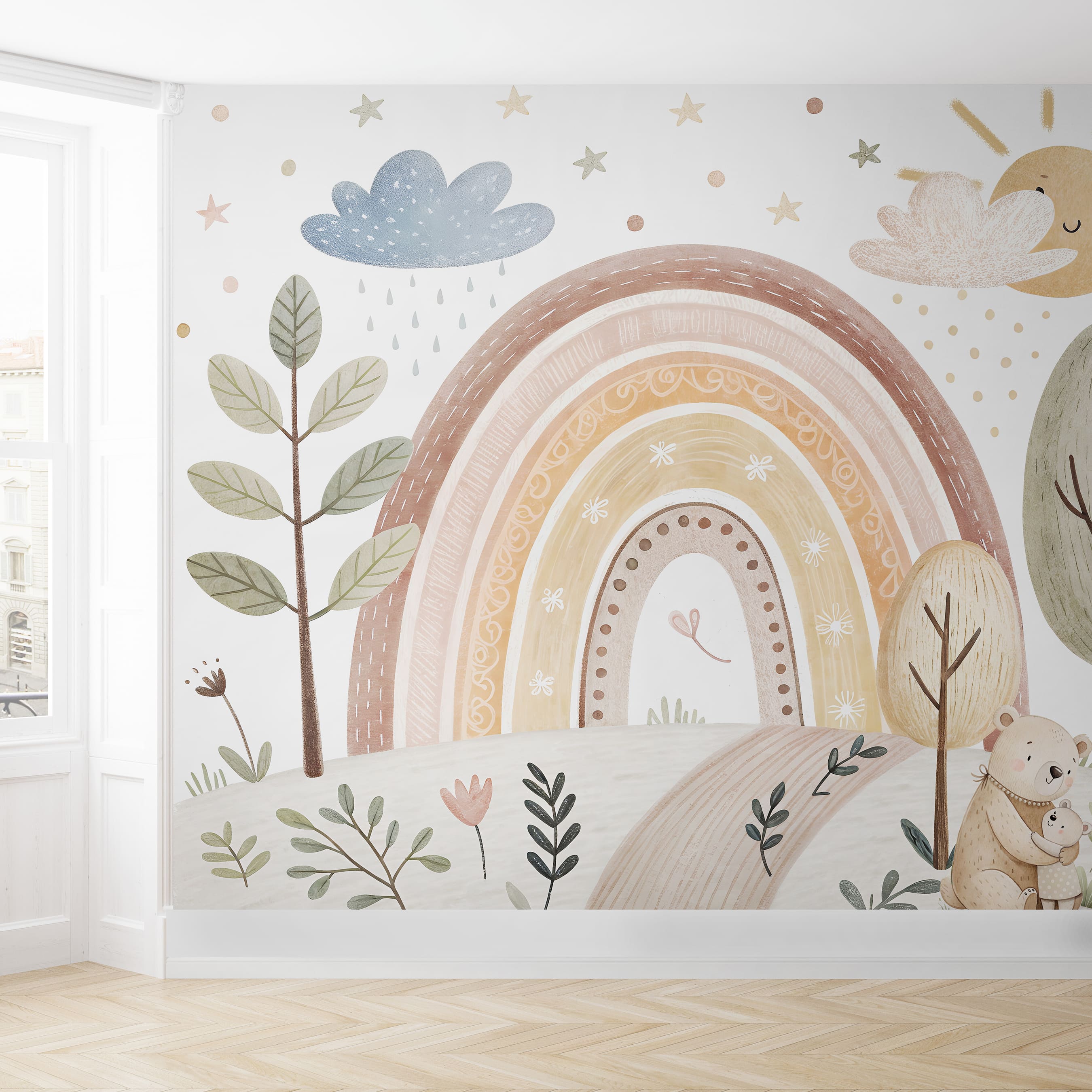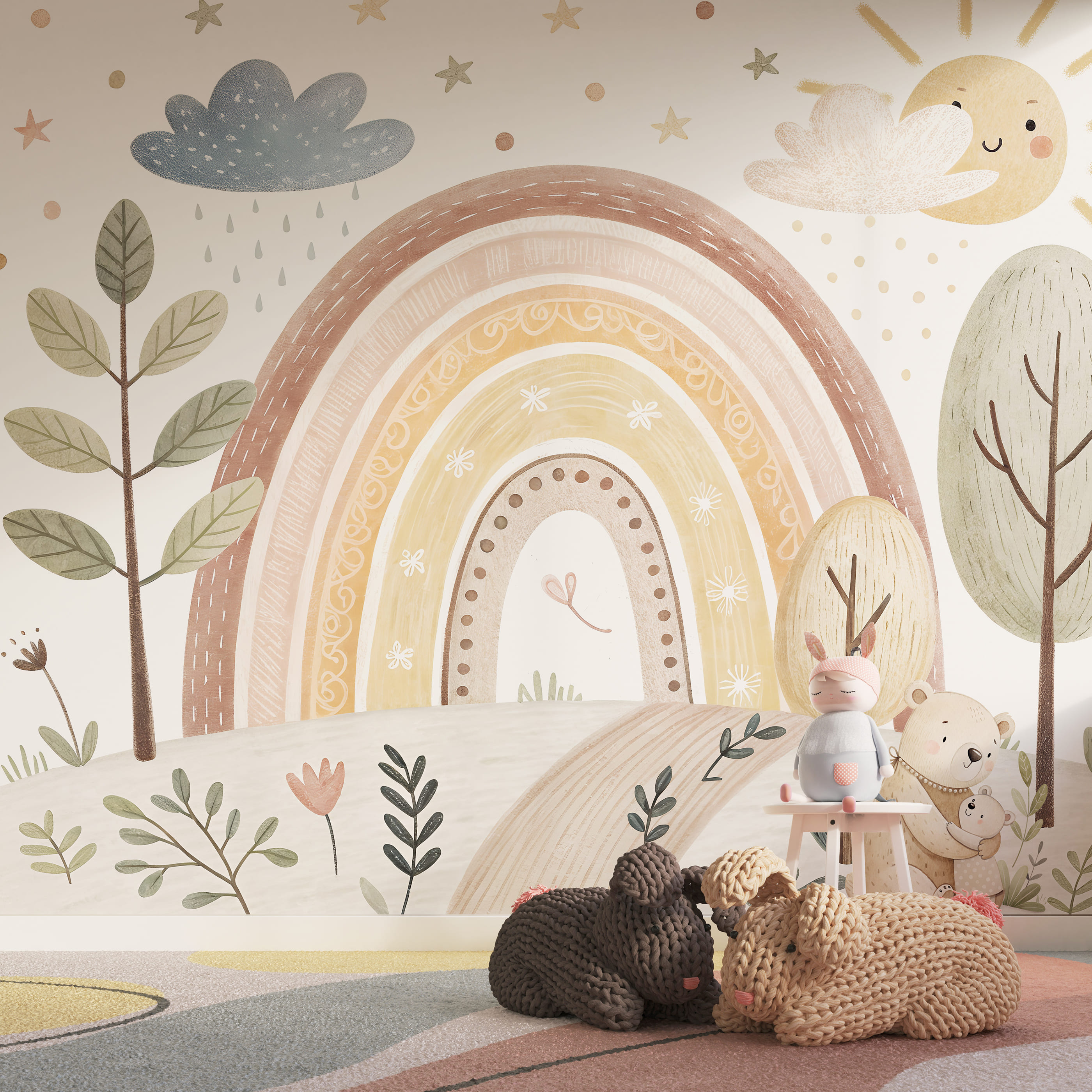 Ніжні фотошпалери у теплих пастельних тонах з веселкою та казковим пейзажем створять справжню атмосферу затишку у дитячій кімнаті. Ідеально підходять для дитячої, садочка, ігрової зони або класу для найменших.