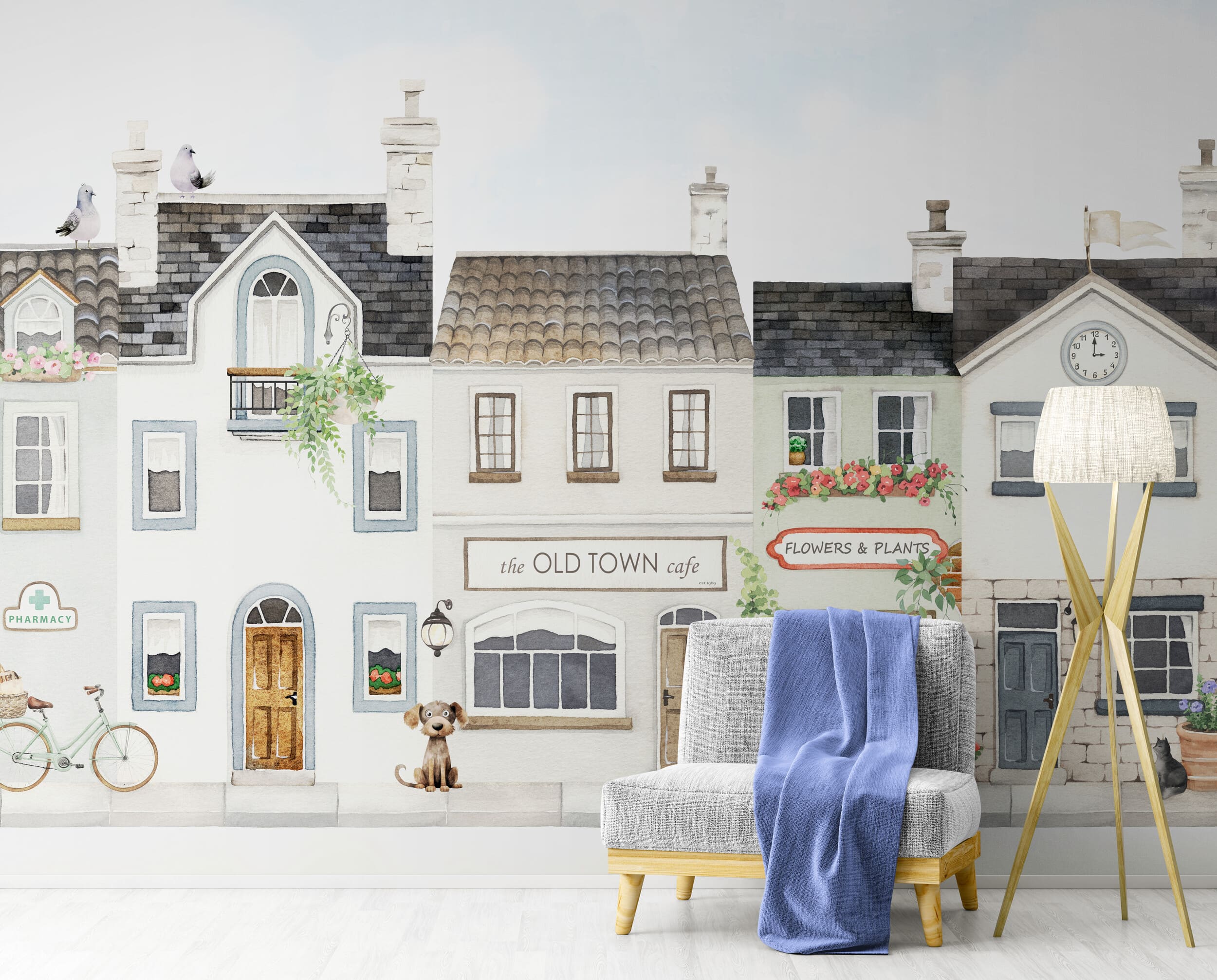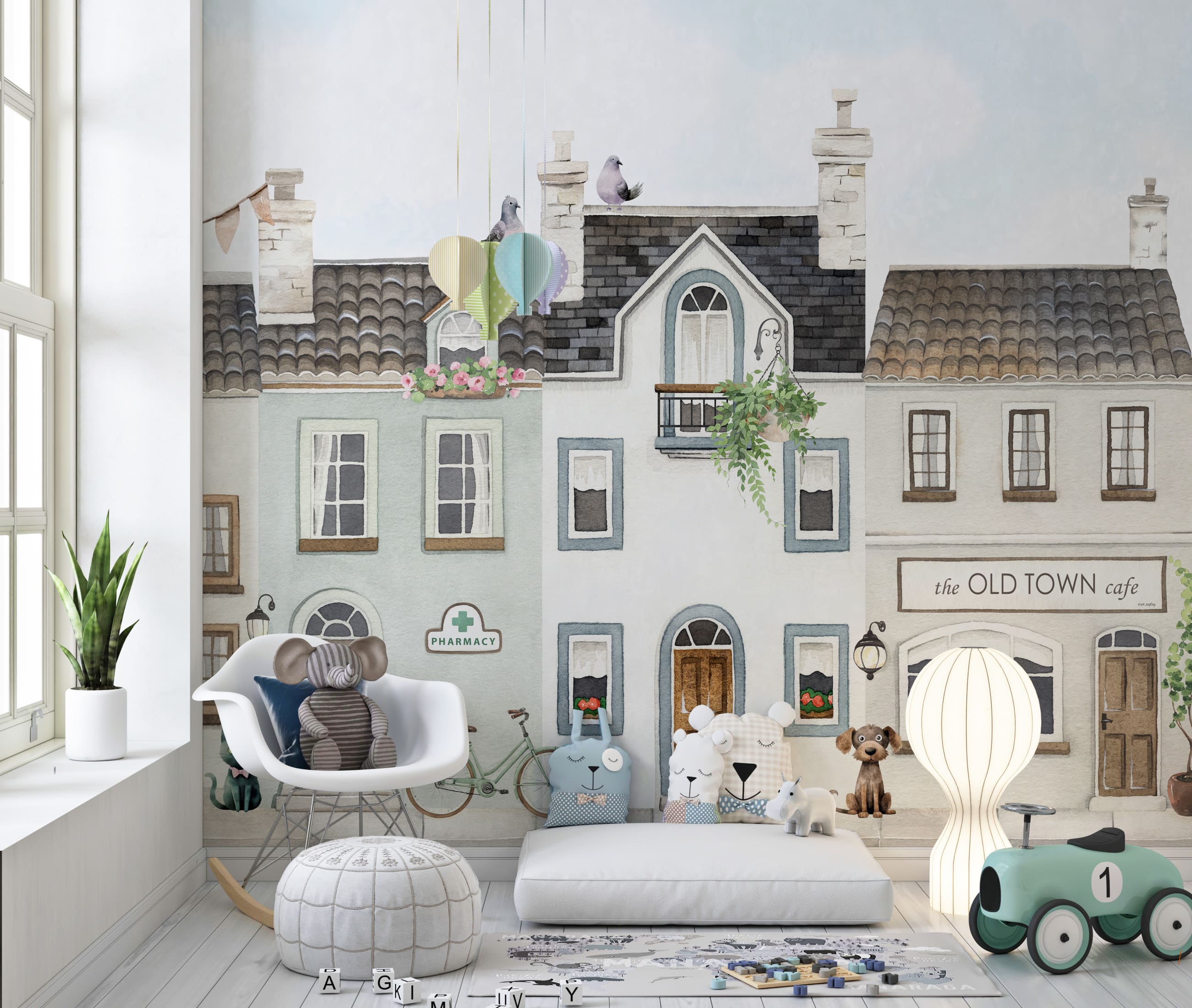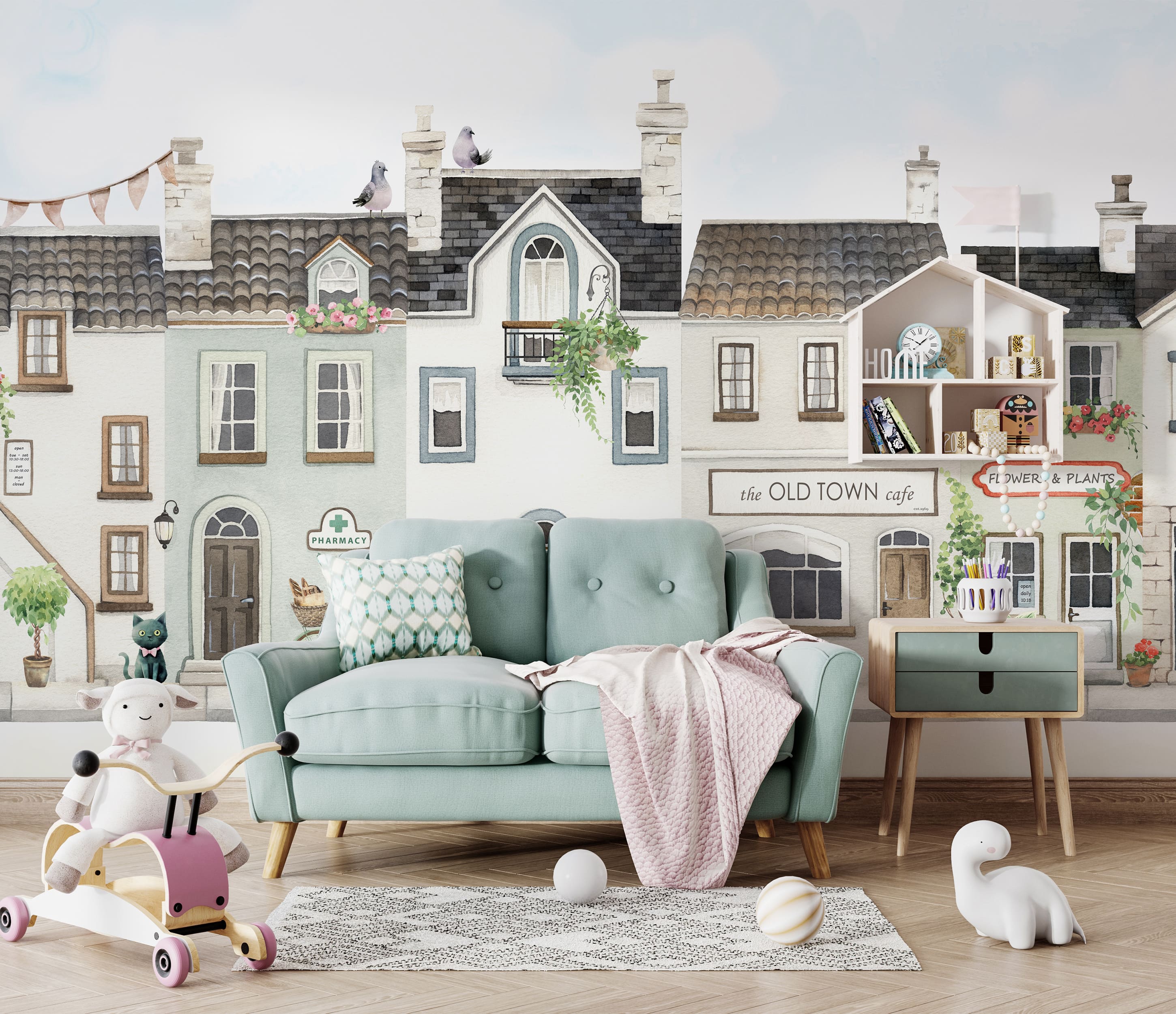 Фотошпалери "Затишне містечко" в акварельному стилі - це мрія вашої дитини. Ніжна кольорова палітра, будиночки з маленькими магазинчиками та кав’ярнями створює простір для ігр та творчості. Шпалери чудово підходять для оформлення дитячої кімнати як для дівчинки так і для хлопчика.