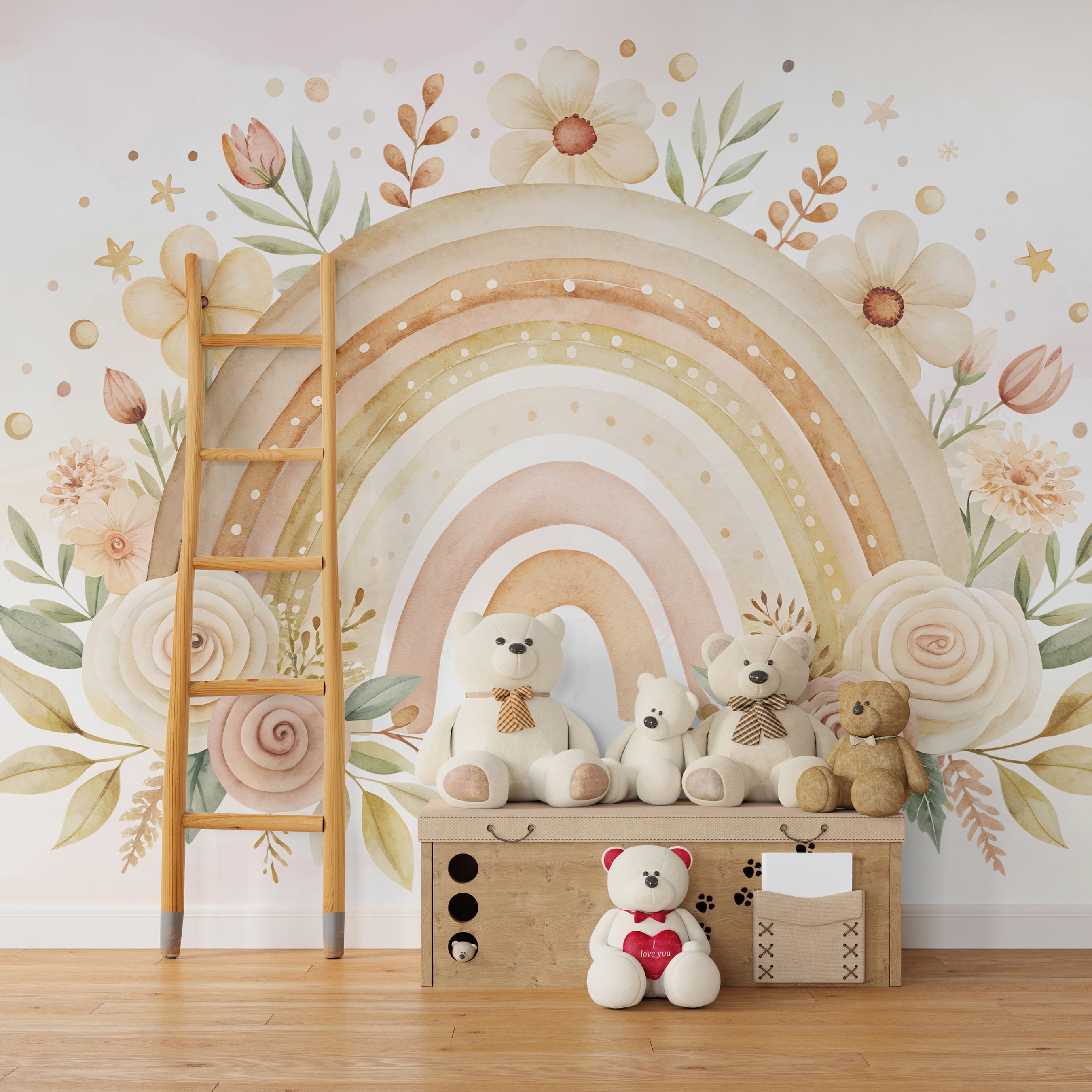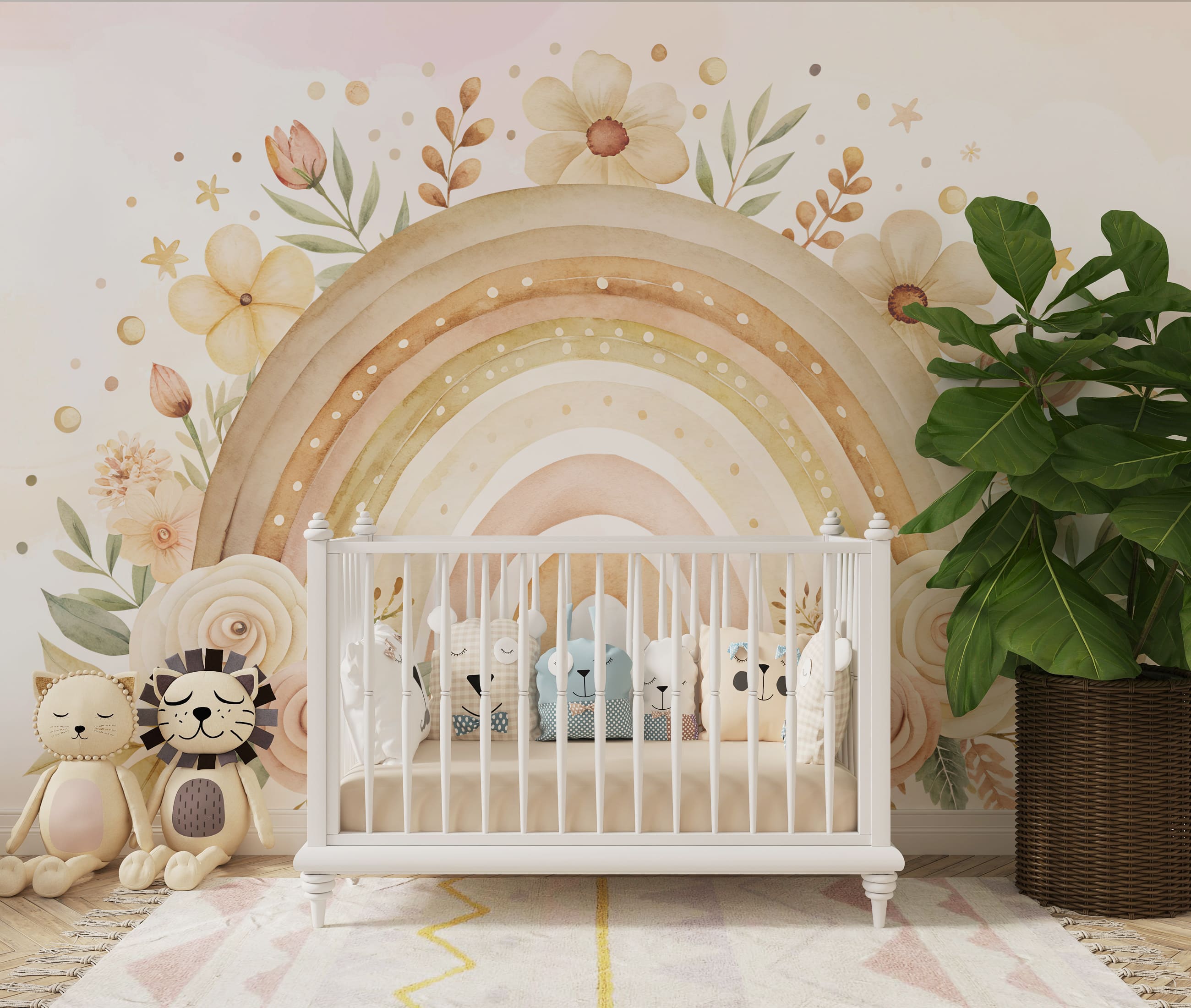 Фотошпалери з веселкою та квітами у бежевих пастельних тонах ідеально підходять для оформлення дитячої кімнати дівчинки. Дизайн виконаний у стилі бохо в акварельній техниці.