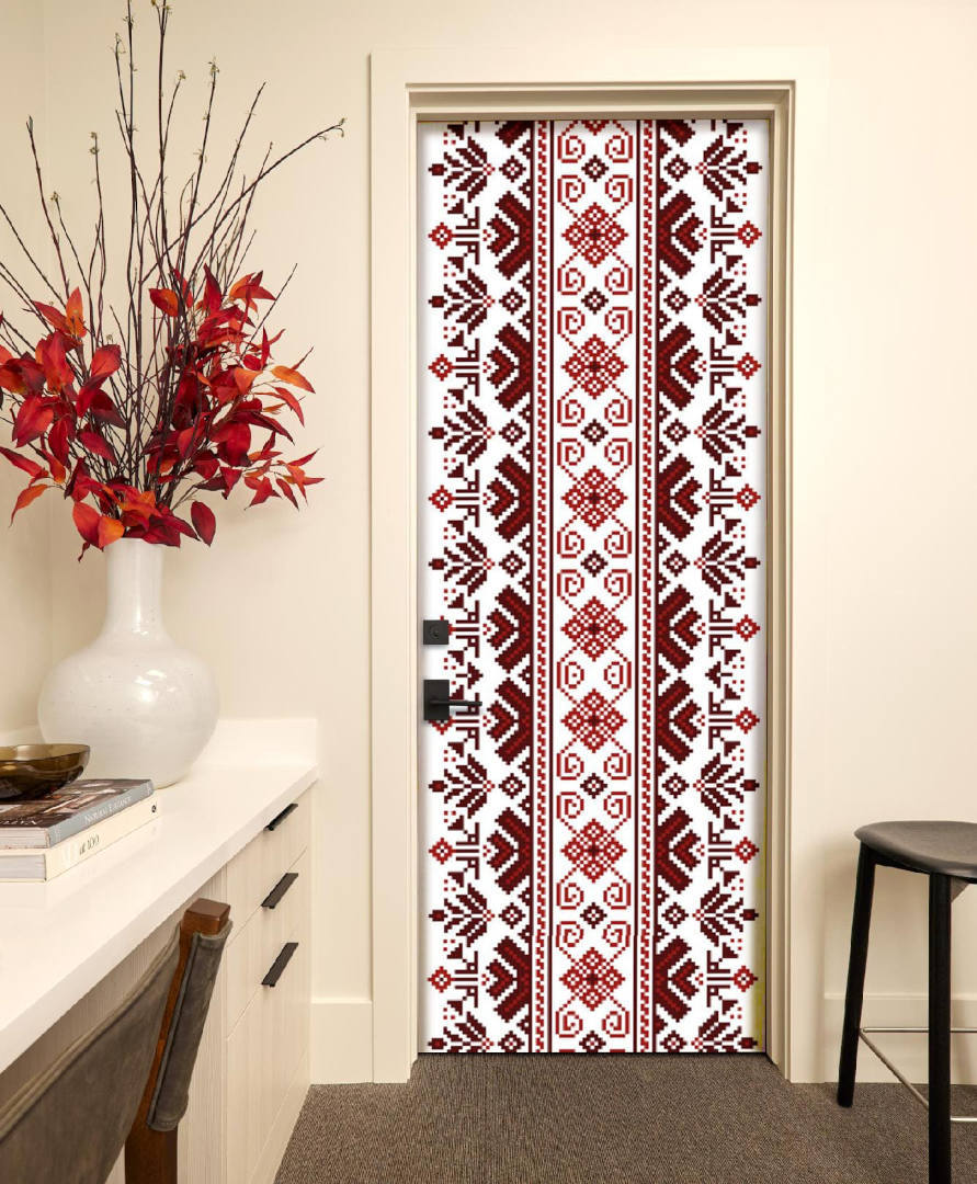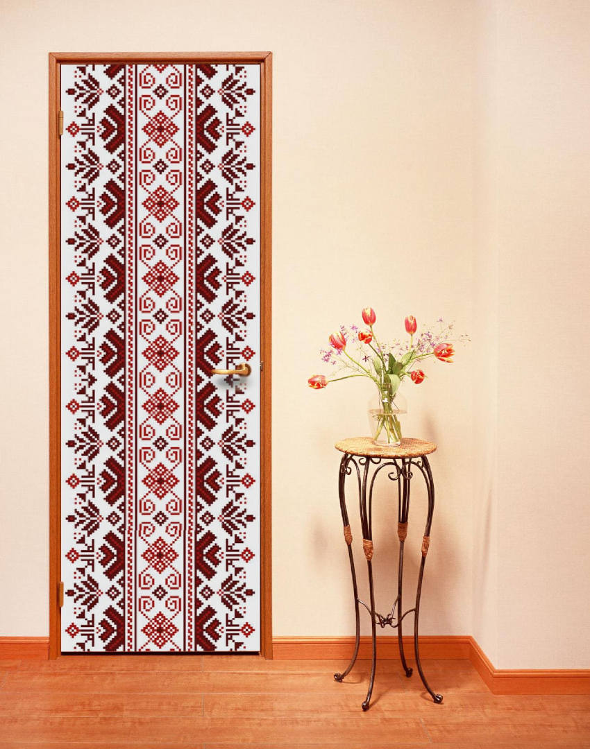 Наклейка на двері "Червона вишиванка" суцільна: наклеюється єдиним полотном. Можна клеїти на будь-які двері: ДСП, МДФ, дерево, скло і т.д..