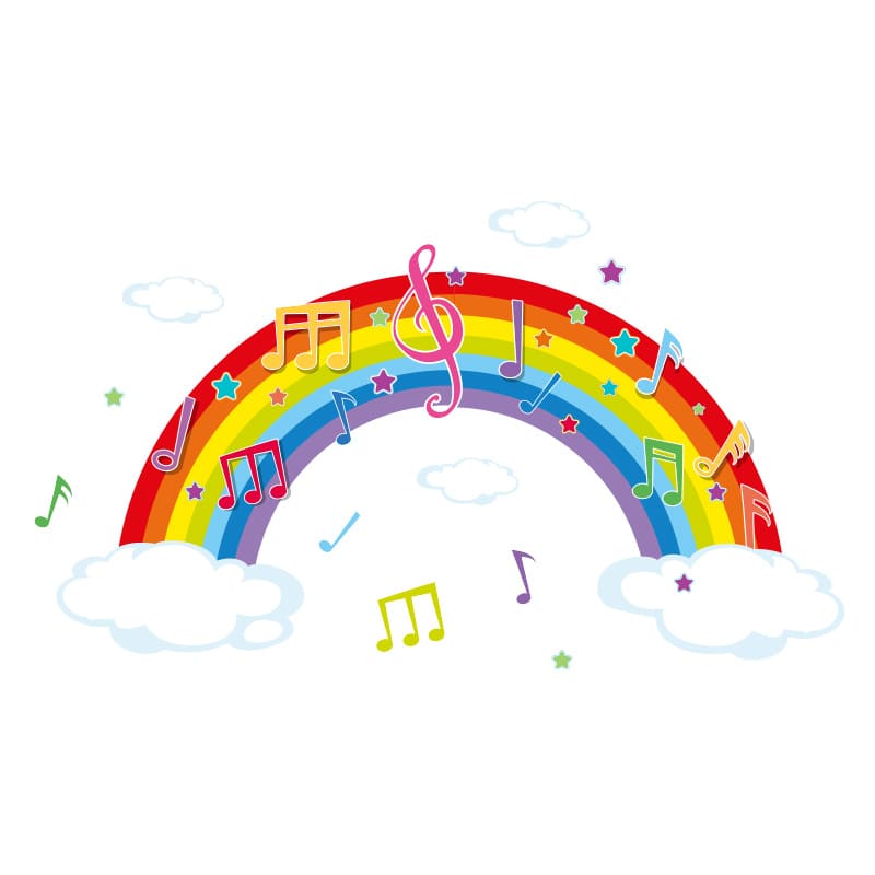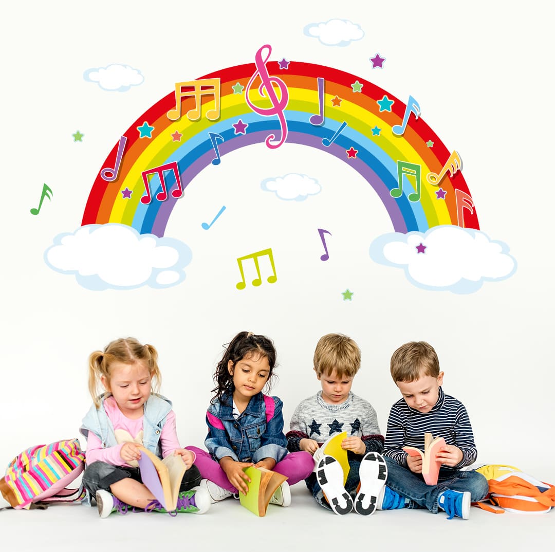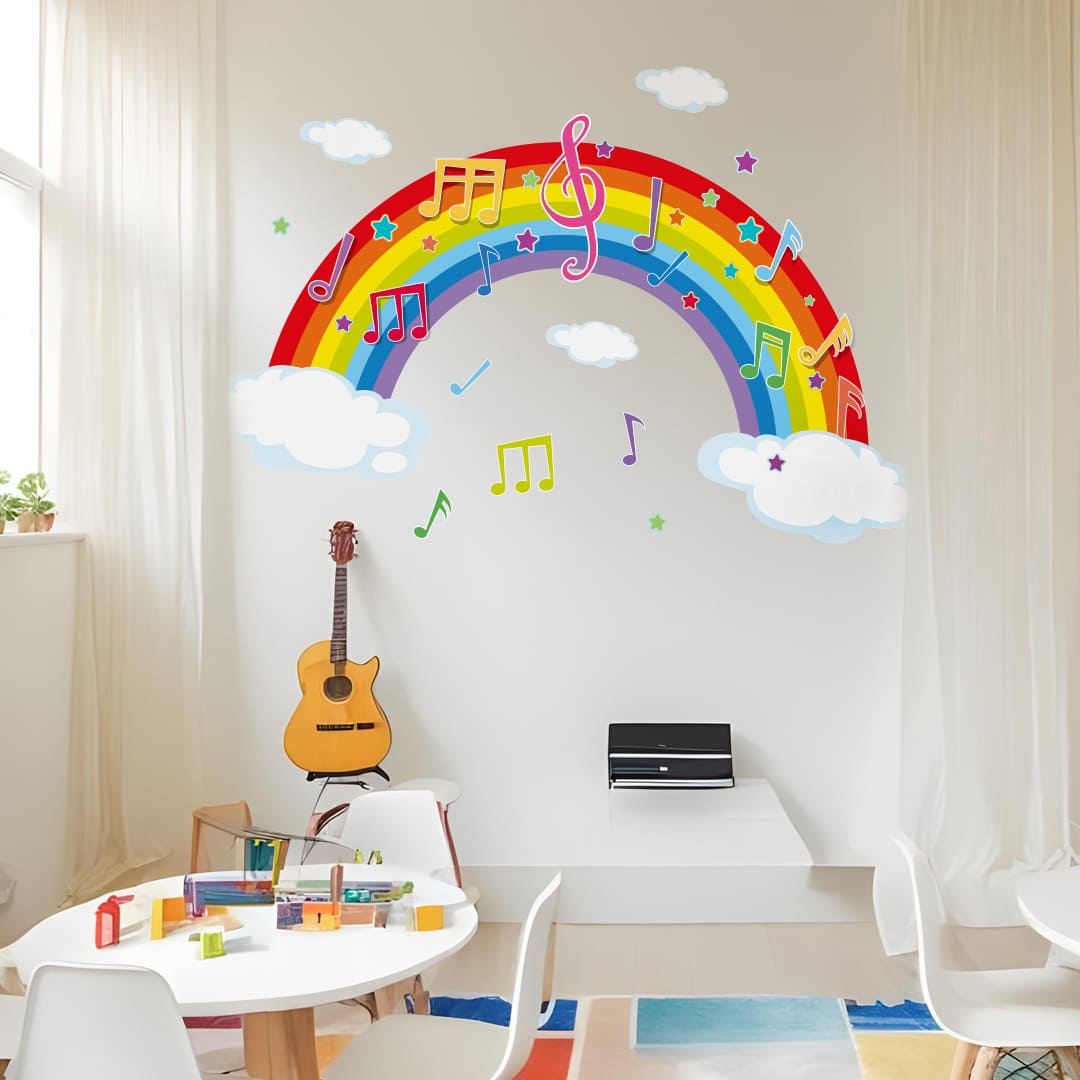Яскрава вінілова наклейка "Музикальна веселка" підходить для оформлення групи дитячого садочка, дитячого центру або класу молодшої школи.