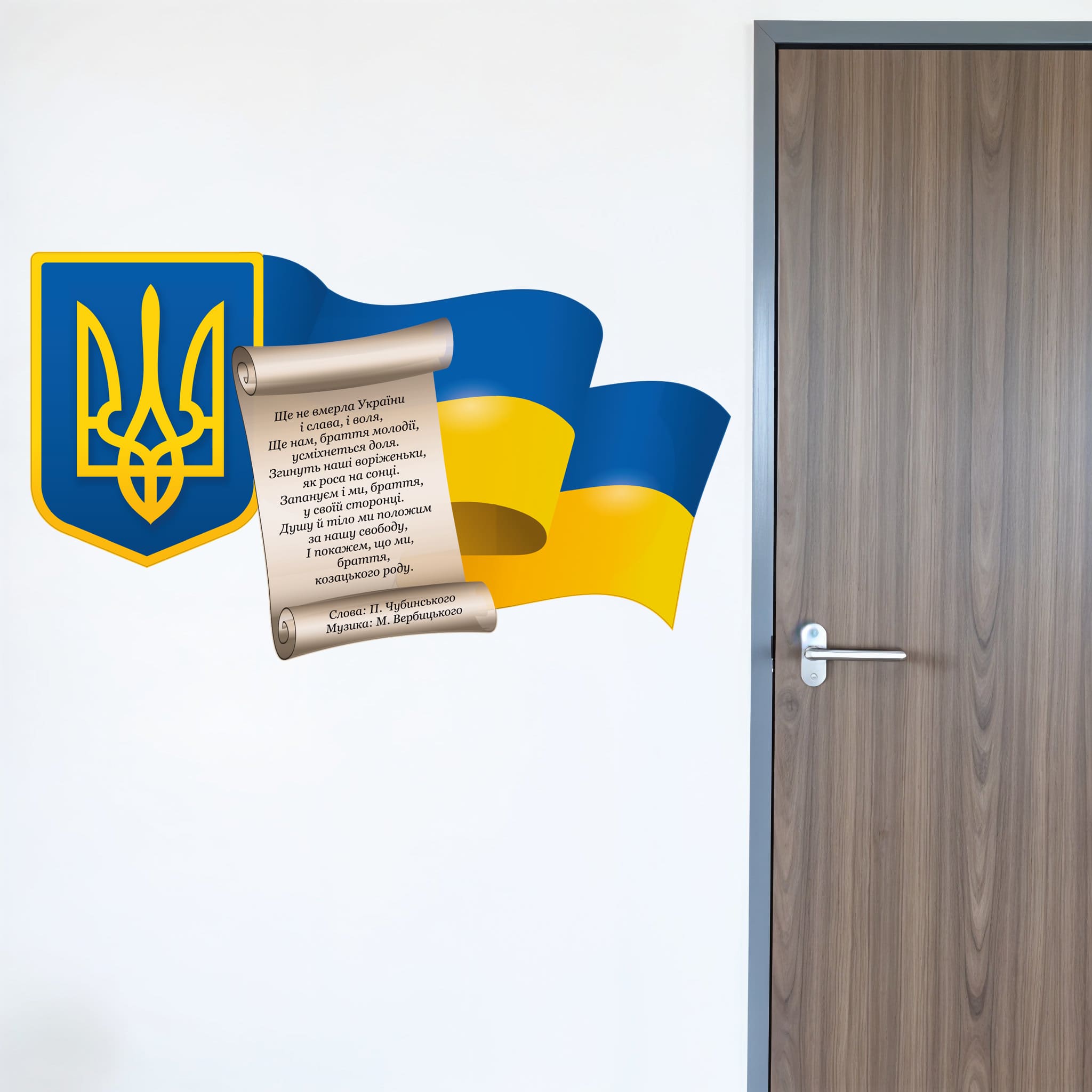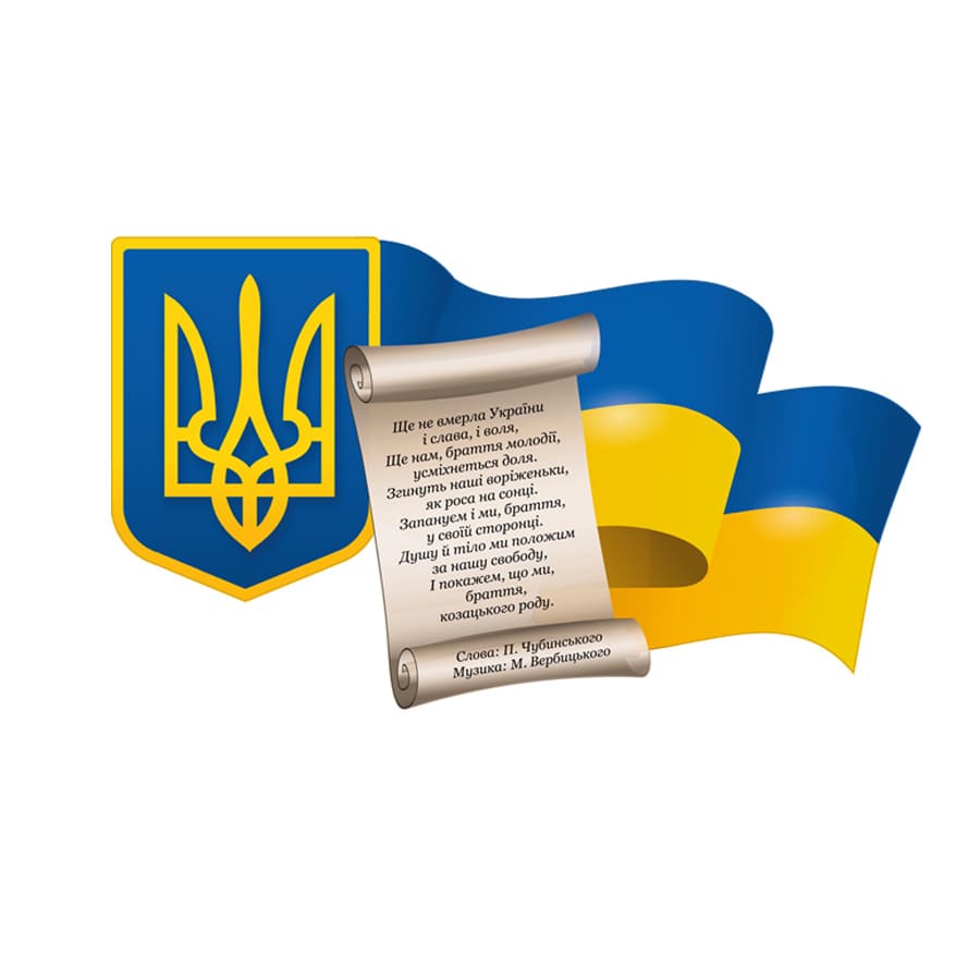 Яскрава та патріотична наліпка, що поєднує головні державні символи України - Герб, Прапор та уривок з Гімну. Ідеально підходить для оформлення класів, навчальних кабінетів та шкільних коридорів. Може використовуватися як елемент тематичного куточка або оформлення патріотичних стендів.